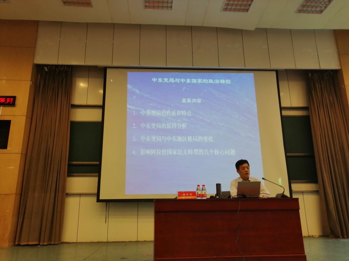 在此次讲座上,刘教授首先介绍了苏丹、阿尔及利亚总统的下台,分析埃及、叙利亚、利比亚等国的特殊性等引入今天的主题“中东变局与中东国家的政治转型”。