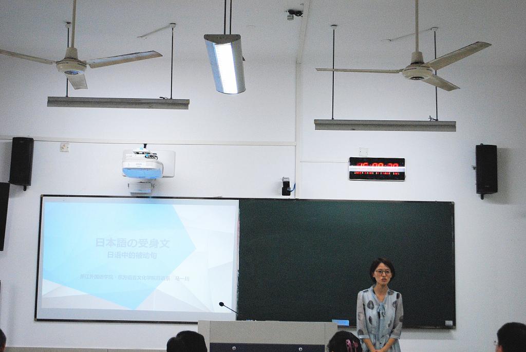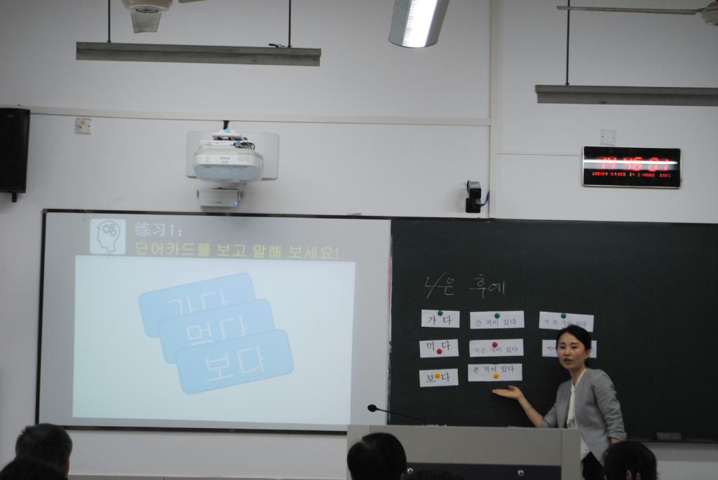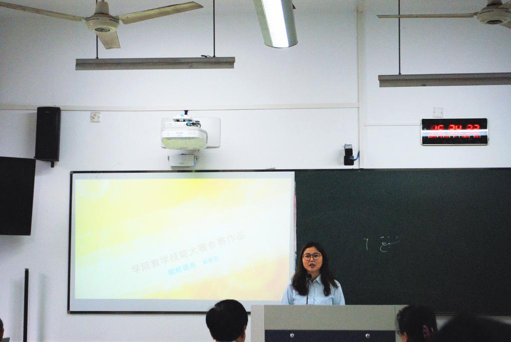 青年教师技能竞赛在望B207教室举行。副院长曹笑笑老师主持比赛,周烈教授担任评委会主任,四个语系的资深教师黄宇雁教授、蒋传瑛教授、金海救教授、沈志兴教授担任评委。