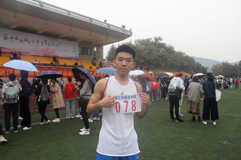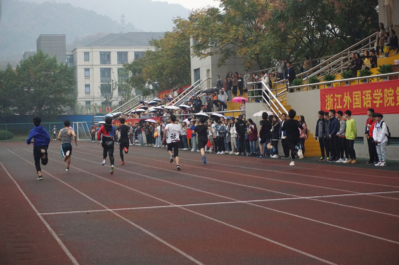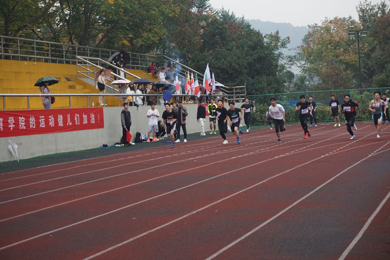 11月7日上午九点四十五分,开幕式结束后紧接着迎来了男子100米预赛,东语参赛选手是19级阿语1班杨孙逸。伴随枪声响起,参赛选手们如离弦之箭奔向终点,运动会赛事便从这里正式展开。