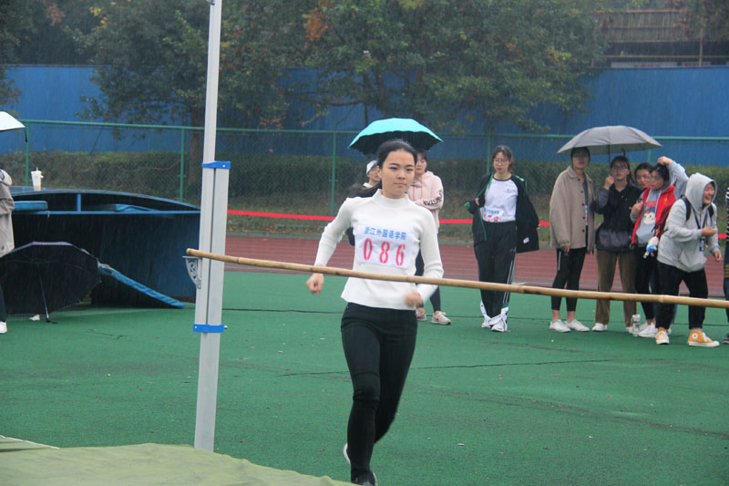 与此同时进行着的是女子组跳高比赛。参赛选手分别为19级阿语1班李一诺,18级韩语2班李颖,19级阿语2班田一彤。赛场上跃动着的是她们轻盈的身影,飞扬着的是她们敢于拼搏的体育精神。