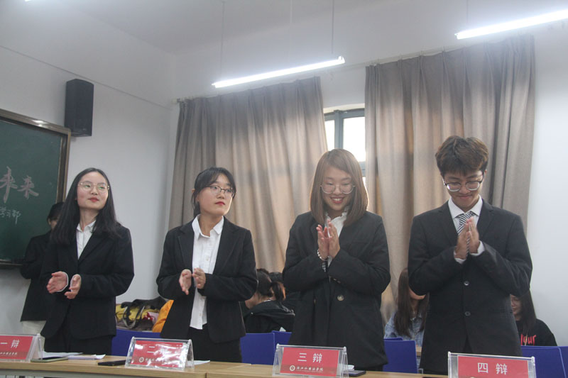 经过紧张而激烈的比赛,在评委们的点评之后,下午四点半,此次新生辩论赛初赛圆满落幕。最终决出了进入半决赛的四支队伍。他们分别是日语一班(一辩洪佳娟、二辩刘叶繁、三辩王静、四辩潘禹翔),日语二班(一辩洪佳蓉、二辩孙曌珺、三辩刘佳音、四辩李之涵),阿语一班(一辩童彬燕、二辩郭洁、三辩唐子涵、四辩高俊),日语三班(一辩张凡、二辩程湘瑜、三辩杨雪婷、四辩马权江)。