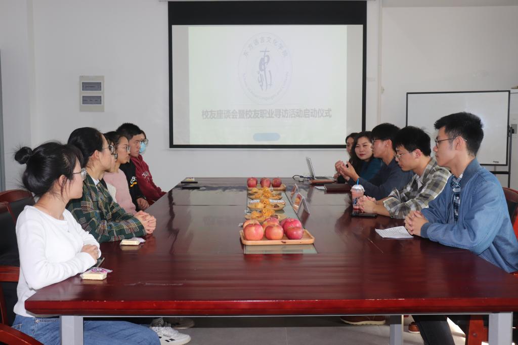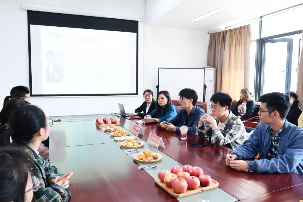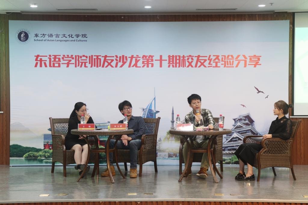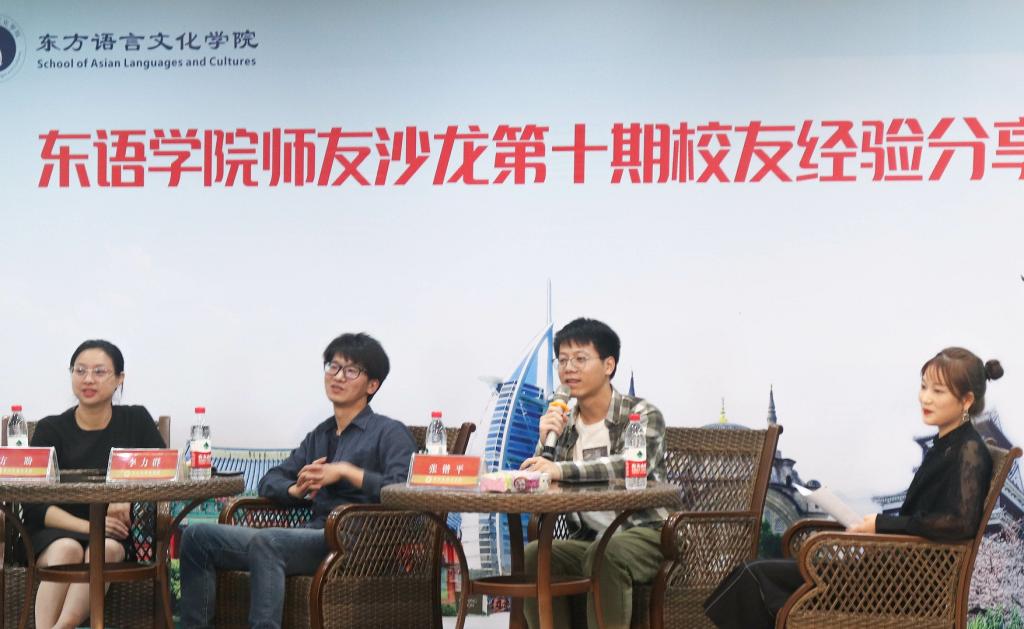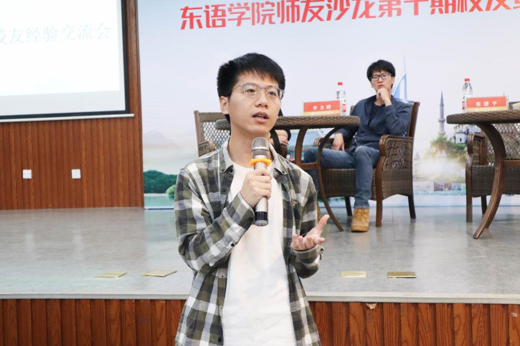 第十期师友沙龙活动暨校友经验交流会在博文堂二楼举行,日语专业2011届毕业生李立群、18届韩语专业毕业生张锴平给东语学子分享了他们的工作经验。