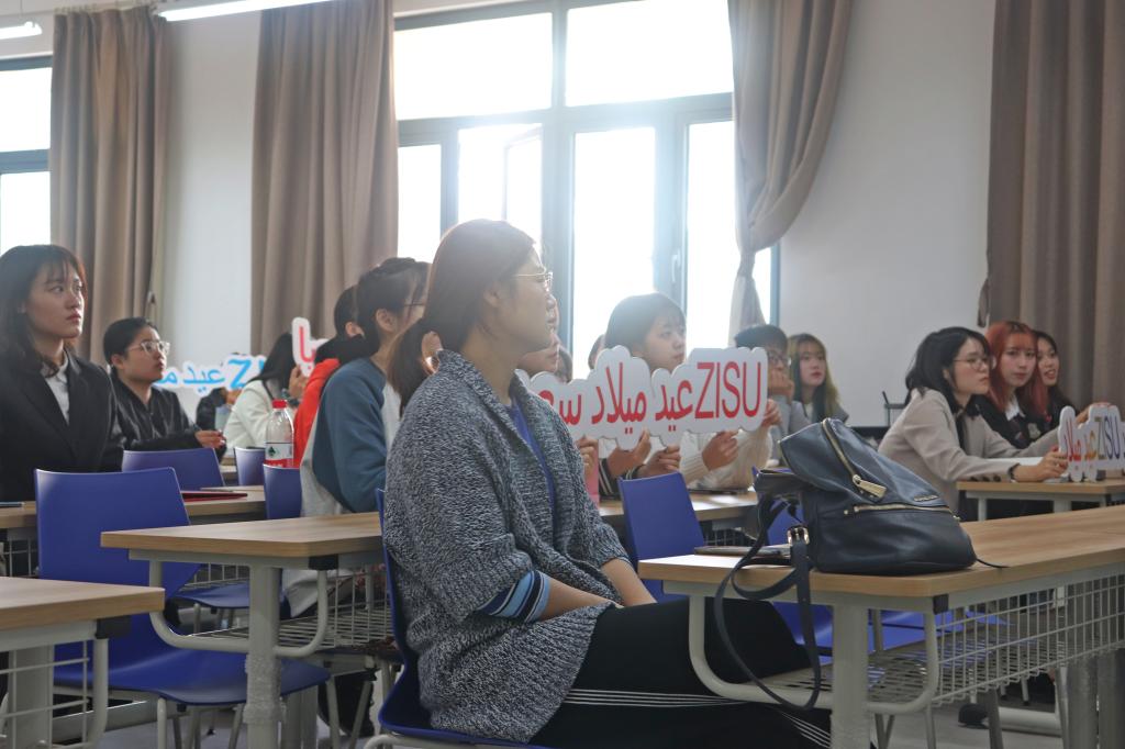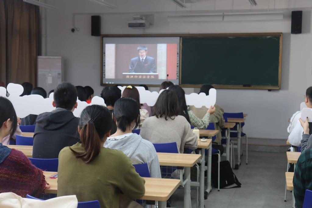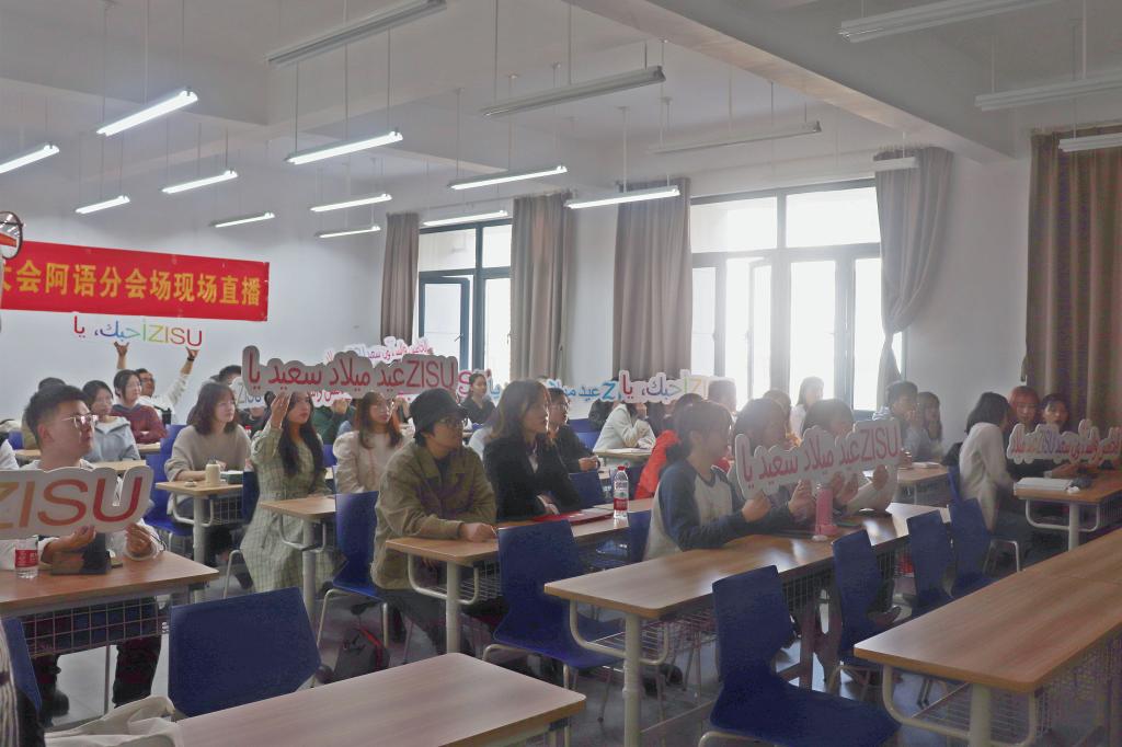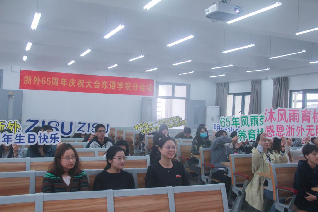 9时30分,浙外65周年庆祝大会阿语分会场现场直播准时开始,阿语系的学子们在融C206认真观看学习。与此同时,中文分会场现场直播在融B207进行着,同学们与学院老师共同分享校庆的喜悦。