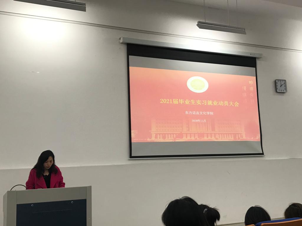 大会上副院长陈新妍老师做动员讲话,她表示在疫情全球化的时代背景下,小语种毕业生面临的就业环境更加恶劣,但我们的同学们要化危机为转机,拥抱变化,努力求新求变,在求职过程中不断磨砺自己。
