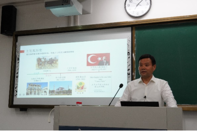 在介绍土耳其概况时,陈玉宝分析道,土耳其的地理位置优越,位于地中海中心,对其经济发展有极其重要的作用。他向同学们展示了土耳其前一百强的企业,期望学习土耳其语的同学们努力学习、奋斗,争取毕业后能成为这些企业的一员。他还分析了土耳其近五十年经济在世界的增加值,结合土耳其货币里拉贬值,介绍了土耳其政府实施的一系列经济政策。