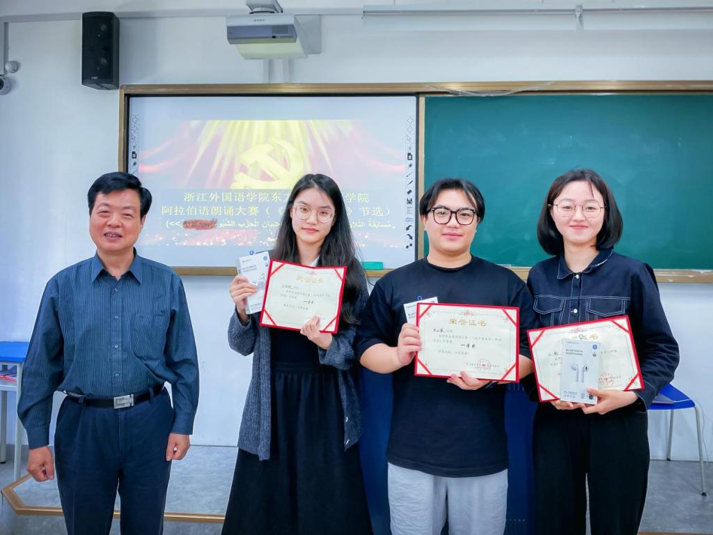5月24日,阿拉伯语朗诵大赛颁奖典礼在融C106举行。我校资深教授、校国别和区域研究中心主任周烈教授,学院党总支书记王永青老师,院长吴玲教授,阿语系主任刘彬老师,以及阿语系教师代表出席颁奖典礼。主持人金明泽老师幽默风趣地宣读了获奖作品名单。