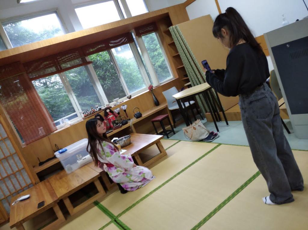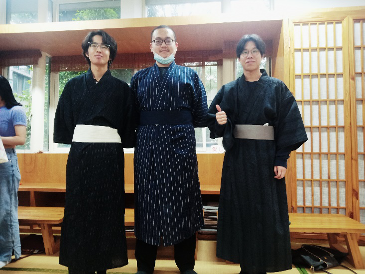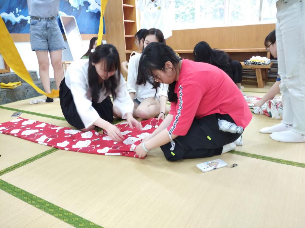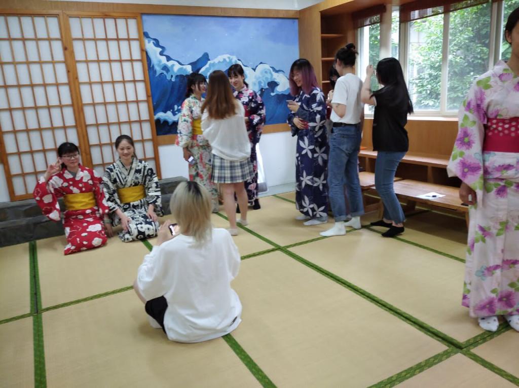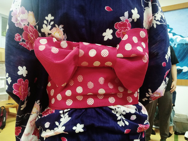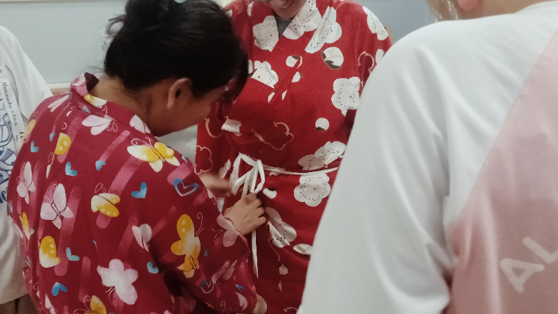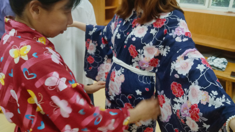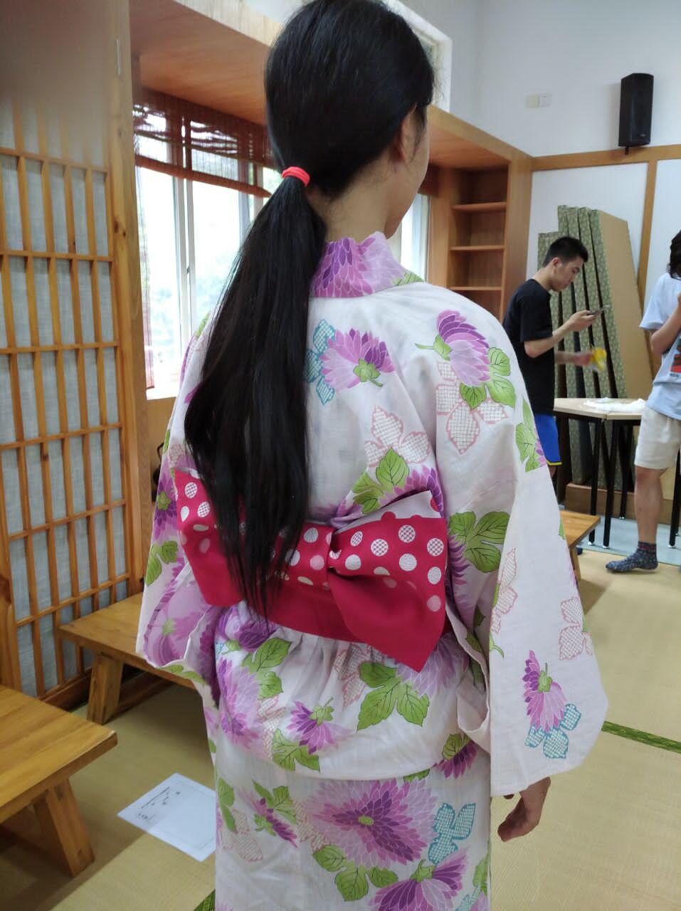 叶山老师一边仔细地解释浴衣的文化和穿着方法,一边为大家示范。浴衣属于一种简易的和服,但要穿戴齐整则需要很多步骤,要穿得好看也并不容易。在叶山老师的精心指导和帮助下,每位同学都穿上了浴衣,五彩斑斓十分美丽。大家都开心地拍照留念。