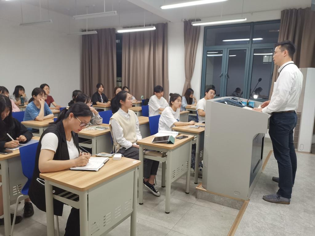 金鑫,先后取得日本东北大学农业经济管理学硕士、博士学位,浙江大学博士后,现为浙江大学中国农村发展研究院助理研究员。他先从“为什么会选择外语专业”这个问题出发,讲述了他对日语的选择。他认为,语言是人与人之间的交流媒介,但是不同语言之间的人们交流便存在阻碍。在本质上,外语是一种工具。但语言作为一种工具,不仅仅让我们能与外国人进行交流,同时也能让我们更深层地了解其他国家历史文化和思想方式。同时,他向同学们讲解了他对大学生科研思维的理解,提出了科研所要具备的五大特质——创新性、逻辑性、执行力、好奇心。