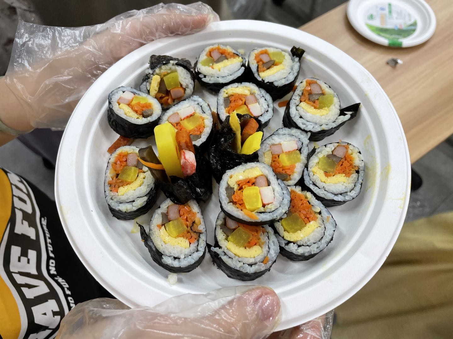 3. 接下来就是最受期待的实操环节啦。在此过程中,两个年级的同学们互帮互助,为对方传递所需食材,共同合作制作美食。大家制作出来的紫菜包饭色香味俱全,同学们完成后纷纷将制作的紫菜包饭分享各位老师和小伙伴们,大家都赞不绝口,制作品尝美食的同时也增进了同学间的友谊。活动结束后同学们自觉收拾整理干净了教室,带着欢声笑语,带着亲手制作的美食结伴离开了活动现场。