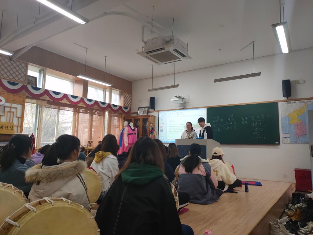 本学期,韩韵风物社在顺利晋升为学分制社团后,以“走进韩国文化—四物乐教学”校级公选课的形式面向全校学生授课,课程理论指导由朝鲜语专业孙霁老师、外教金秀衍老师负责,实践教学部分采取新老社员互助学习的模式,选课成功的同学可以修得课程对应的全球文化素养模块的学分。
