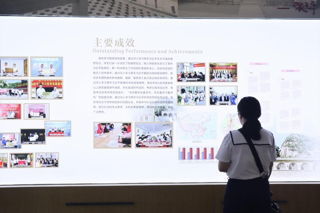 在“青年学子学青年习近平”学习教育展厅,新生们认真学习了浙外开展“青年学子学青年习近平”学习教育的初心,了解到学习教育的具体做法、成效和社会影响。通过触摸这里蕴含的理想信念与价值追求,相信同学们一定会在心中树立远大理想,以实现中华民族伟大复兴为己任,在浙外校园奏响“请党放心,强国有我”的时代强音。