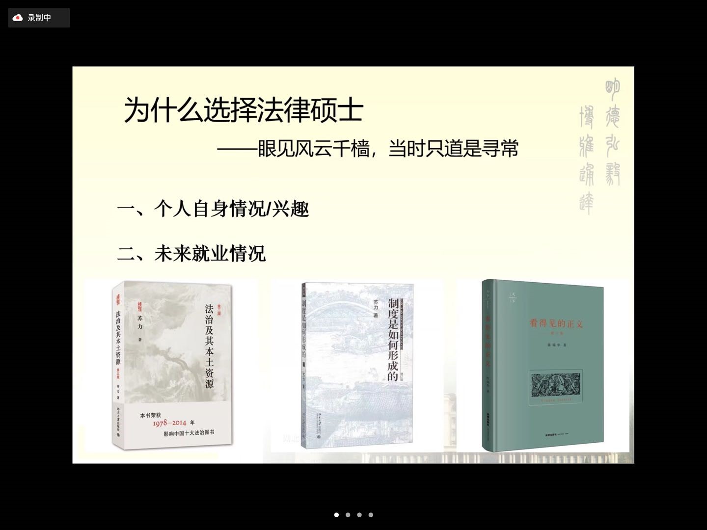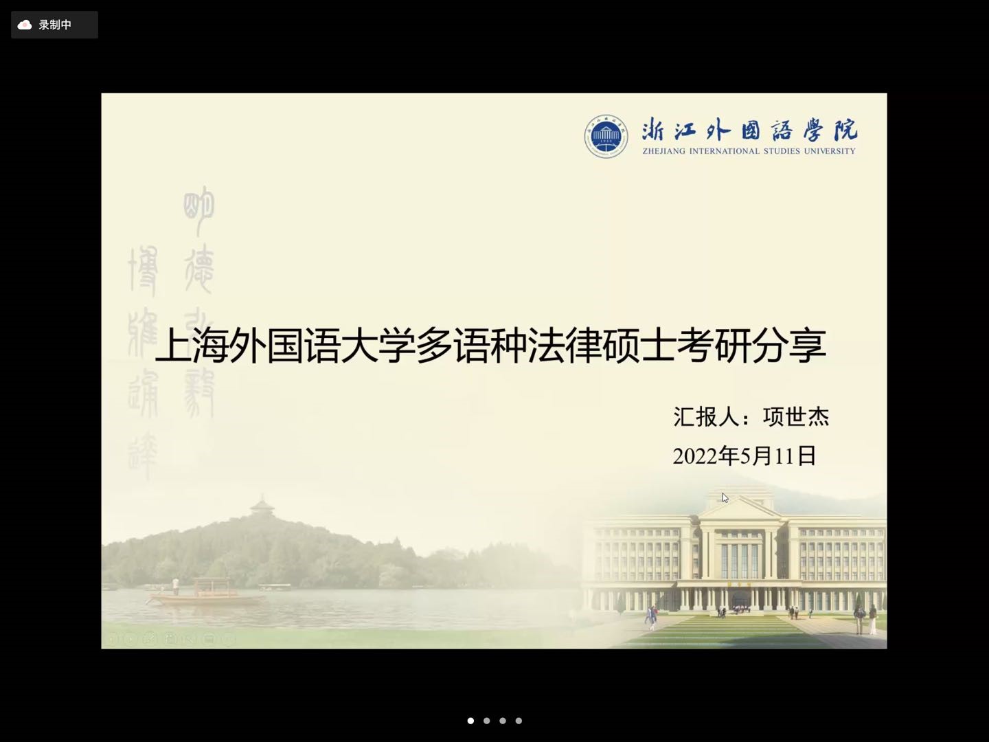 项世杰学长目前就读于上海外国语大学法律(阿拉伯语方向)硕士专业。他从法律硕士考研的考试科目、近年考研概况,以及就业渠道入手,为同学们深入浅出地分析了小语种法律硕士的备考路径和就业前景,使学弟学妹们对小语种专业跨考有了较为详细的基础认知。随后,他指出考研要充分考虑自己的兴趣方向和将来的就业前景。