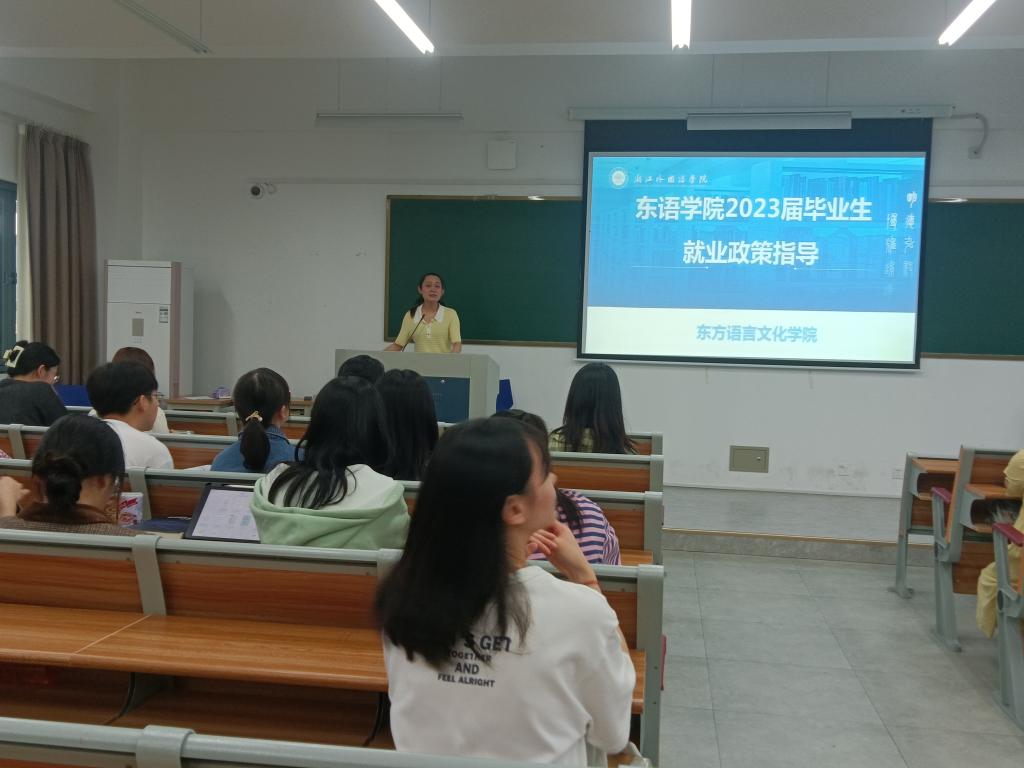 辅导员郑周璇,在融D202教室为2023届朝鲜语、土耳其语专业毕业班学生进行就业政策指导和就业简历制作专题讲座。