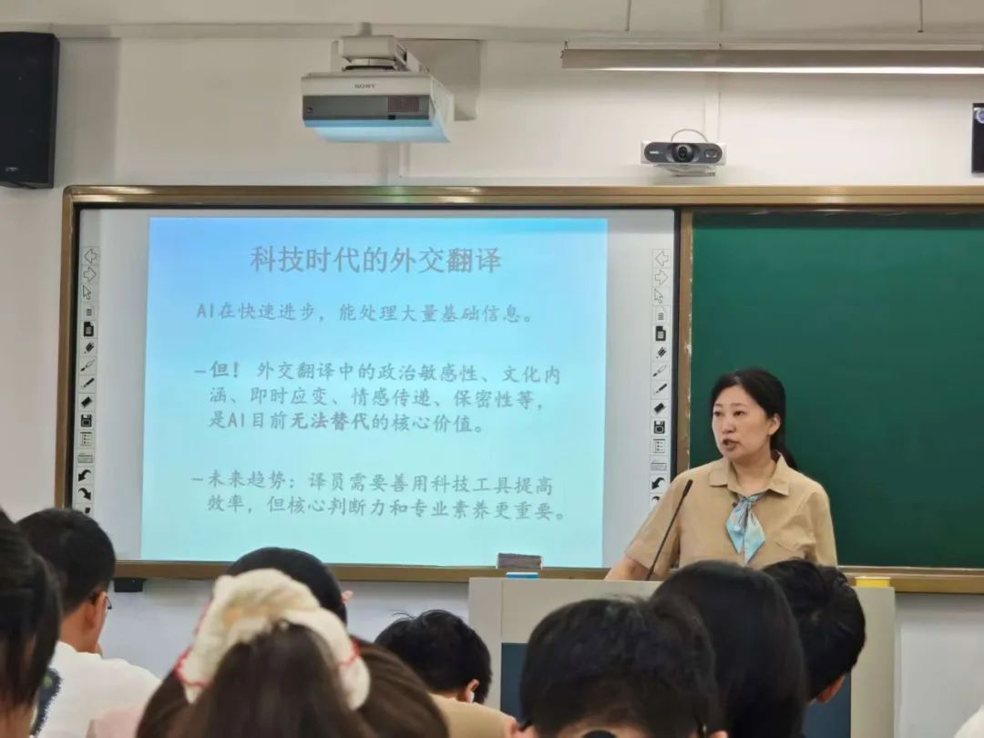 讲座伊始,孙瑱教授结合其丰富的学术背景与实践经历,向同学们生动描绘了外交翻译工作的核心场景与独特魅力。她开宗明义地指出:“外交官的语言就是国家的武器”,精辟地道出了语言在外交博弈中的战略地位与翻译工作所肩负的重大责任。孙瑱教授强调,外交翻译不仅是语言的转换者,更是国家立场、政策与文化的重要传递者,其精准性与时效性直接关系到国家利益与国际形象。