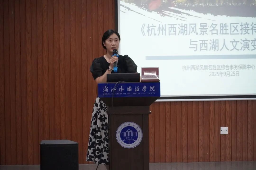 最后,刘洁结合具体案例,阐述了优质服务与文化传承的紧密关联。她以苏东坡任杭州知州时,精心策划游湖活动并以诗文记录其过程为例,说明从古至今,“服务”始终是西湖文化传播的重要环节。她特别提到,如今的西湖不仅是享誉世界的风景名胜,更扮演着 “城市会客厅”的重要角色,肩负着向世界展示中国文化魅力与城市文明形象的使命。刘洁对在场的青年学子寄予殷切期望:作为外语专业学生,你们手握语言的“钥匙”,更有责任以语言为桥梁,将西湖的文化之美、中国的文化之韵传播到更远的地方。