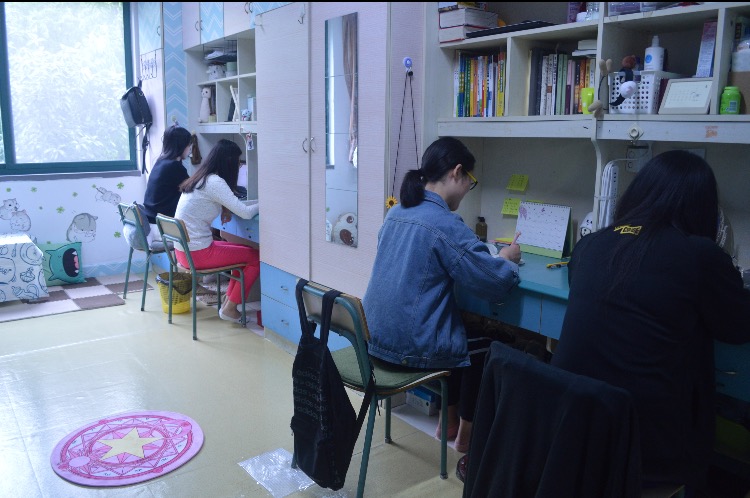 205寝室的成员有:肖晶、朱紫青、方歌蕾、王佳颖。她们寝室的壁纸和窗帘都是粉红色的,可爱又好看,桌面和地面也十分干净整洁。更可贵的是,寝室的同学们在学习完专业课后还积极地自主学习习大大的事迹。