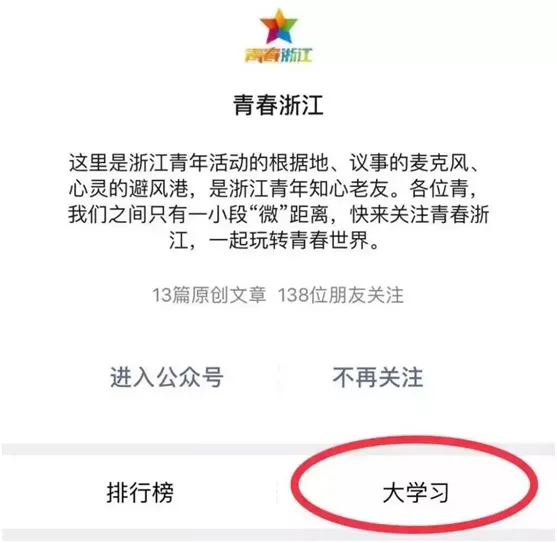 步骤一:关注公众号“青春浙江”(微信IDzhejiangtsw)选择“大学习”