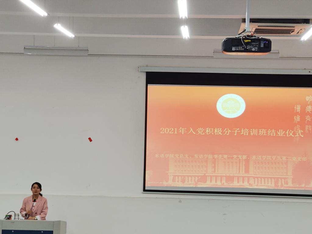 2021年上半年入党积极分子培训班结业仪式在融D108举行,学院党总支副书记方盼老师、学生第二党支部书记郑周璇老师出席结业仪式。
