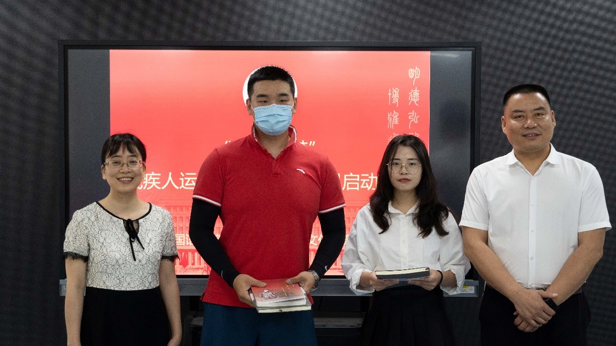 夏颐书记和陈志彪主任为参加结对的大学生志愿者和运动员颁发了就学结对项目成长记录本,并为运动员赠送了由我校编写的《青年学子学青年习近平》学习教育教材。