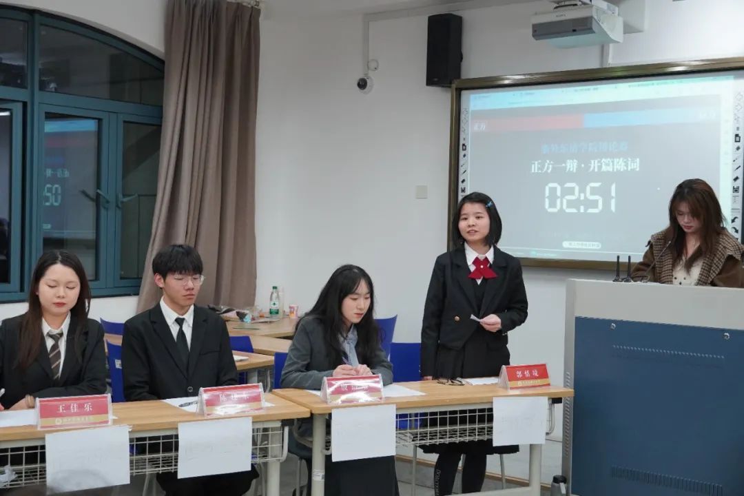 活动伊始,主持人简述本次比赛规则与流程,介绍了参加本次辩论赛的选手和评委。本次辩论赛围绕“AI技术是否能够真正理解小语种的文化内涵”的辩题展开。正方辩手由郭恬境、殷语璠、陈建东、王佳乐同学组成。反方辩手由程柯语、林依诺、吕姿乐、林雨轩组成。