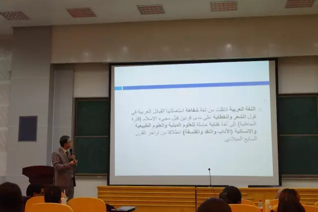 随后,代表团一行来到望院C116,摩方文学院院长茂胡伯教授为阿拉伯语系同学进行主题为《阿拉伯语的结构与功能特征》的讲座。讲座由刘彬老师主持,阿语系全体师生出席了本次讲座。