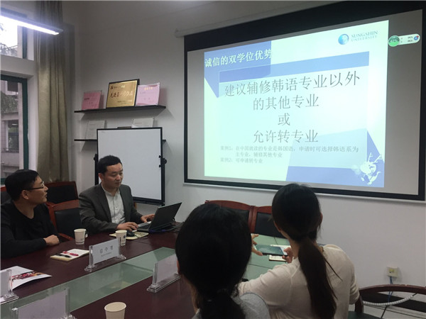 各专业概况,介绍了各专业的发展历程及相应的师资队伍。并详细阐明了2+2中外合作办学的构想,提出双方在学生交流、实地实习、教师交换、青年教师培养等方面的相关合作设想。接着,韩国诚信女子大学代表积极肯定两校友好合作历程,双方就2+2双学位合作办学项目、本硕5年连读项目、假期短期合作留学项目等交流事宜展开深入探讨。最后,金日组长重点介绍诚信女大的学校状况,对留学相关信息也做出了详细说明和答疑。