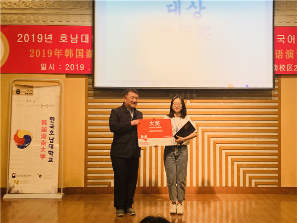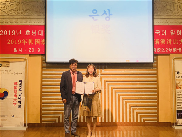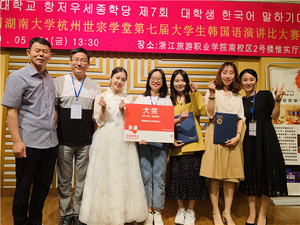 韩语系派出的三名同学斩获本次演讲比赛的三大奖项,黄瑶同学凭借着流畅大方的演讲,优秀的临场应变能力摘得第七届杭州世宗学堂演讲比赛大奖,获得去韩国湖南大学语言研修一周的机会,并由杭州世宗学堂提供往返机票。方歌蕾同学获得金奖,王娅茹同学获得银奖。