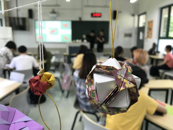 接下来在日语系老师和同学的指导下,同学们自己动手制作日本折纸工艺品代表之一——くす玉(药玉)。