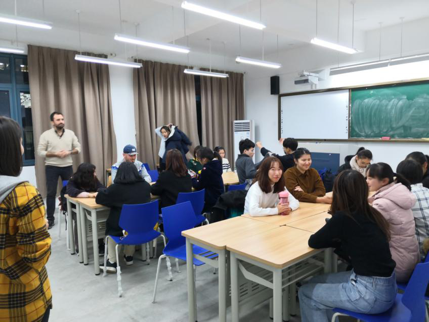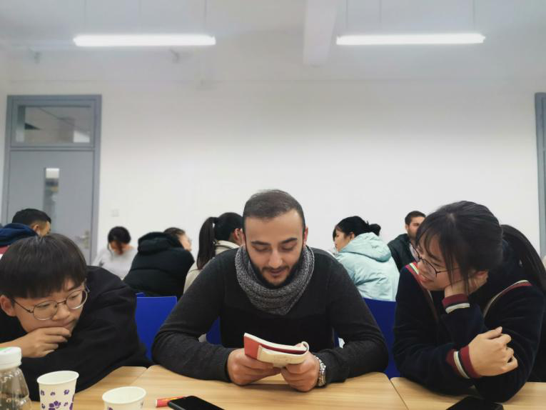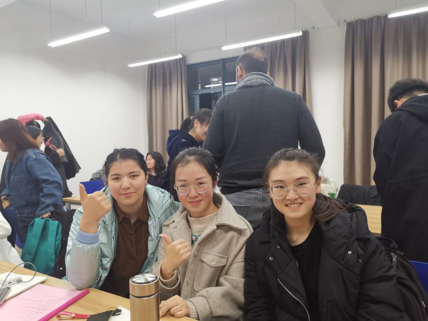 后半个小时是用中文进行的交流。各位中文学习者用他们或熟练或生涩的汉语,和同学们聊得津津有味。他们有的向同学们展示了学习中文所用的课本,有的在本子上写下了新学的汉字与拼音,有的还现场唱起了自己学会的中文歌曲《甜蜜蜜》。