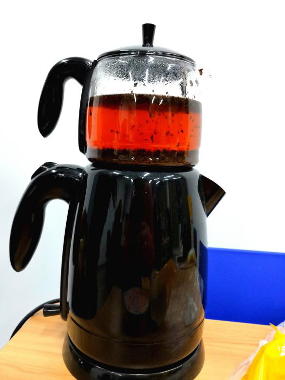 活动一开始,李永花老师、张荻老师就在教室后面忙碌了起来,她们正在协助Pinar外教制作土耳其红茶。土耳其红茶就是由这个极富特色的双层土耳其茶壶烹制而成的,壶中的红茶呈现出浓淡适中的琥珀色,香气馥郁,沁人心脾。聊天间隙,老师们将土耳其红茶一一送到同学面前。初次品尝后,18、19级的同学们纷纷赞叹其香沁甘醇,令人回味无穷。