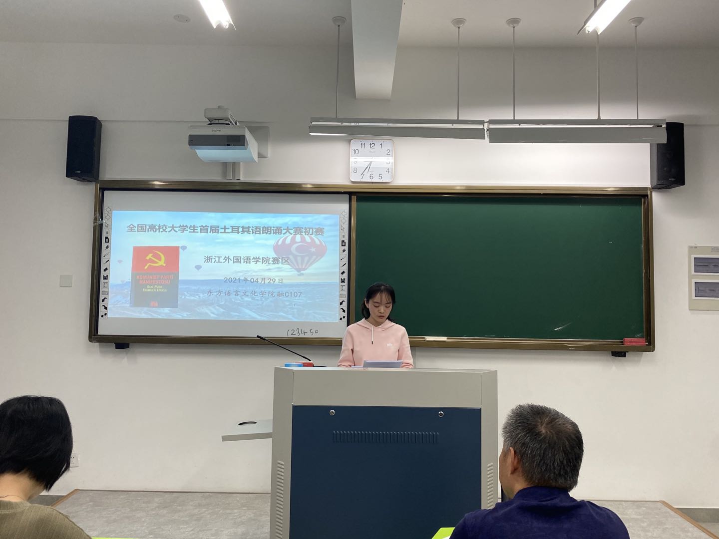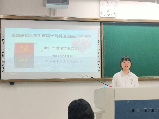 参赛选手们逐个上台朗诵,赢得了台下同学们的掌声。本次朗诵比赛,选手们在朗诵时既需要把握好土耳其语发音的准确性、语音语调及停顿,还需要在朗诵时注入情感,注意与评委及观众的交流,对各位选手都很有挑战性,但选手们的表现都可圈可点,让人眼前一亮。