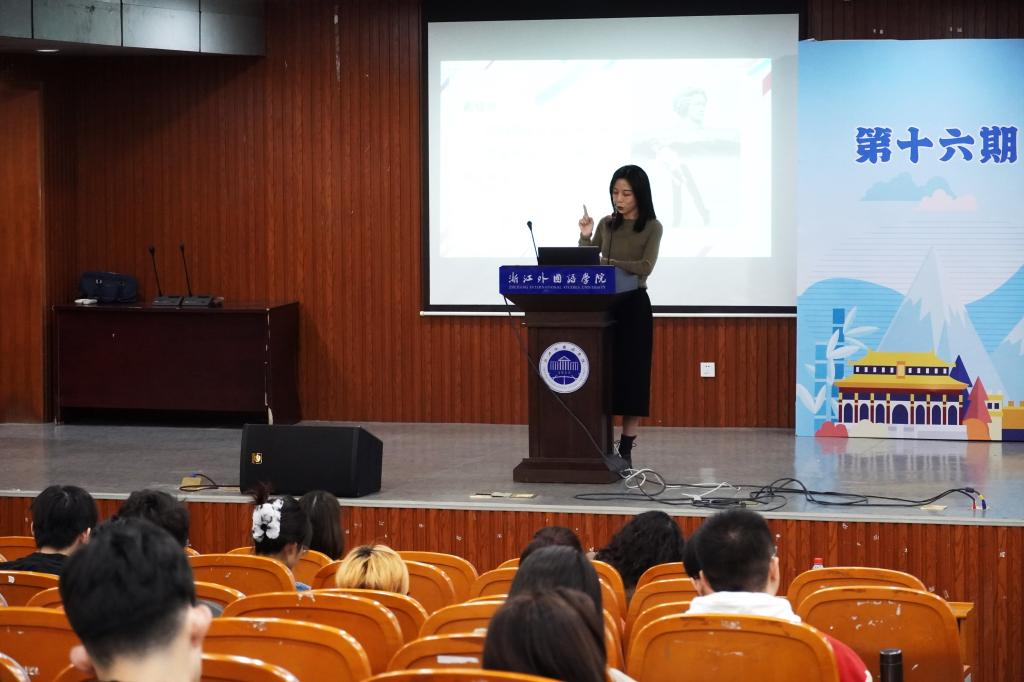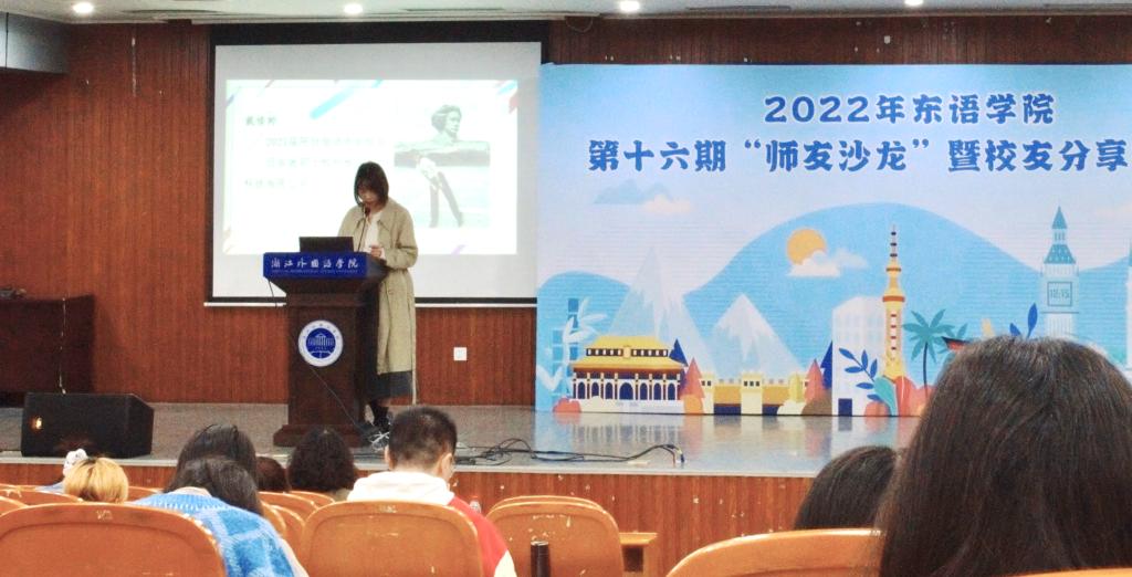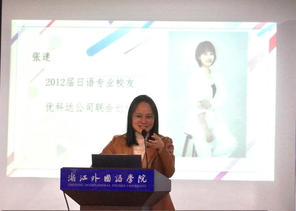 第三位作经验分享的,是2012届日语专业毕业生、优科达公司联合创始人张迷学姐。针对当今大学生就业“跳槽”频繁,职业规划不明确的状况,她结合工作经历表达了自己的看法。她认为,成功离不开一定的契机和窗口期;要敢于尝试,同时在每一份工作和经历中收获经验,通过不断地复盘和与总结,对自己的思维方式进行升华,转化为自身的积淀,以应用到今后的工作之中。她告诉同学们,要学会在错综复杂的时代洪流中学会稳定自身方向,使人生保持在螺旋上升过程之中。