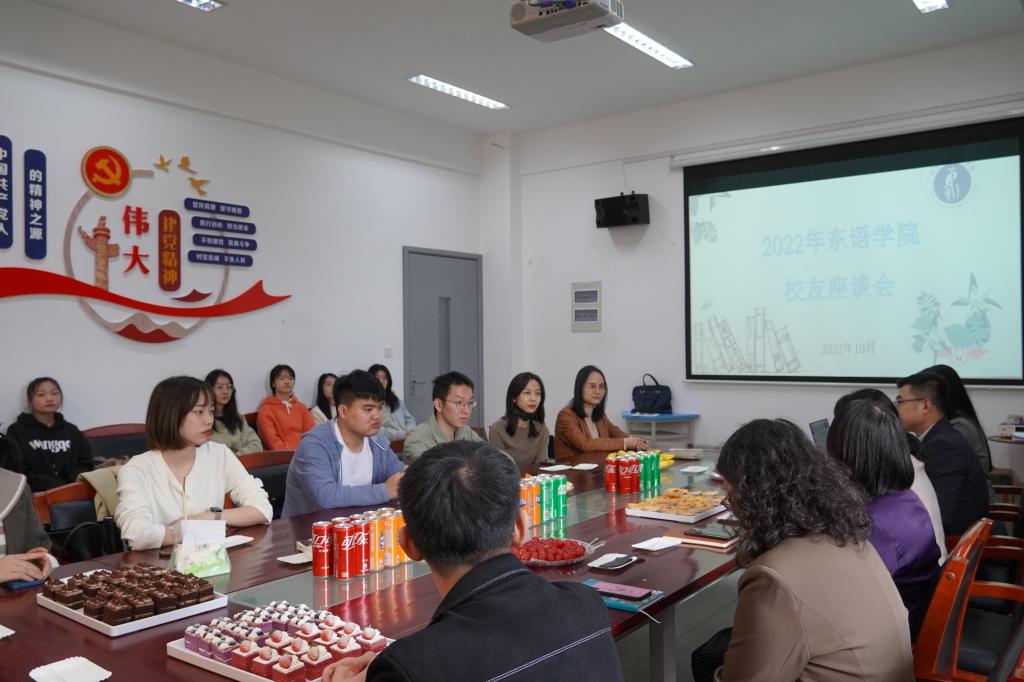 最后,校友们移步学院会议室开展座谈会。院长吴玲教授,学院党总支书记夏颐、党总支副书记宋洋,日语系副主任许翠微老师,各年级辅导员老师们,学生代表出席座谈会。大家就校友们的近况以及学校、专业的发展情况等展开了亲切的交流,老师们对校友的事业给予了关怀和鼓励,现场氛围温暖融洽。