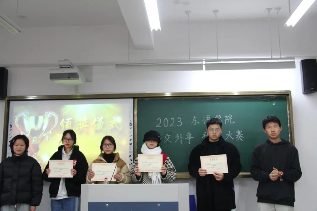 激烈角逐后,金雯雯,张忆宁,陈莎莎,朱天义同学获得一等奖,吴碧霞,吴熙晴,刘诗睿,李芋林同学获得二等奖。评委为获奖选手们颁奖并合影留念。