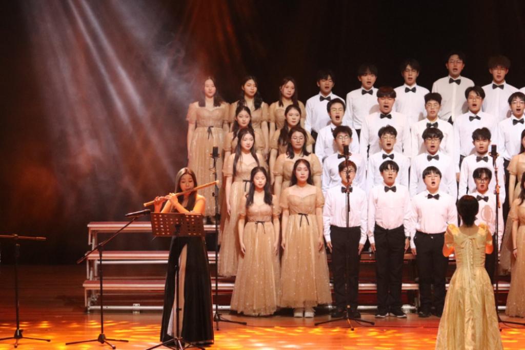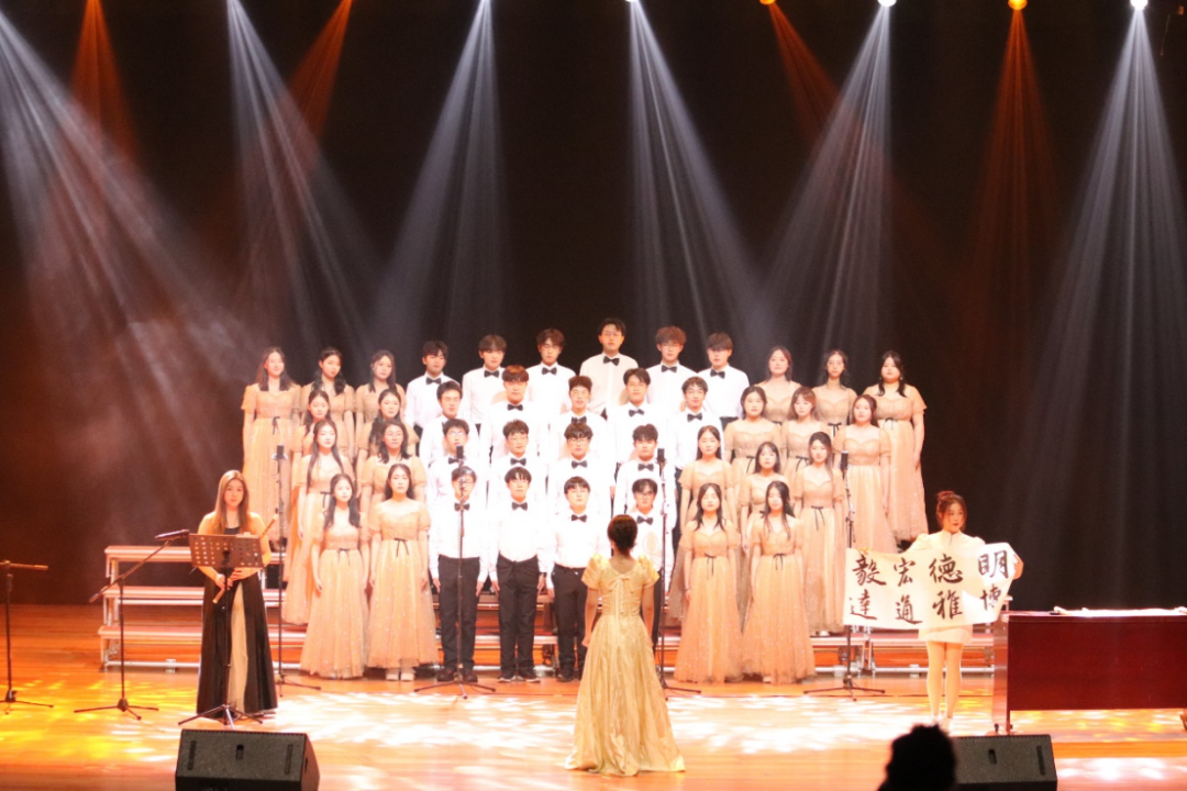锦绣中国,盛世华诞;愿以寸心寄华夏,且将岁月赠山河。“天耀中华,天耀中华,风雨压不垮,苦难中开花。”同学们唱出了热情,唱出了气势。
