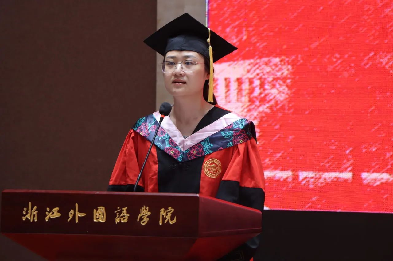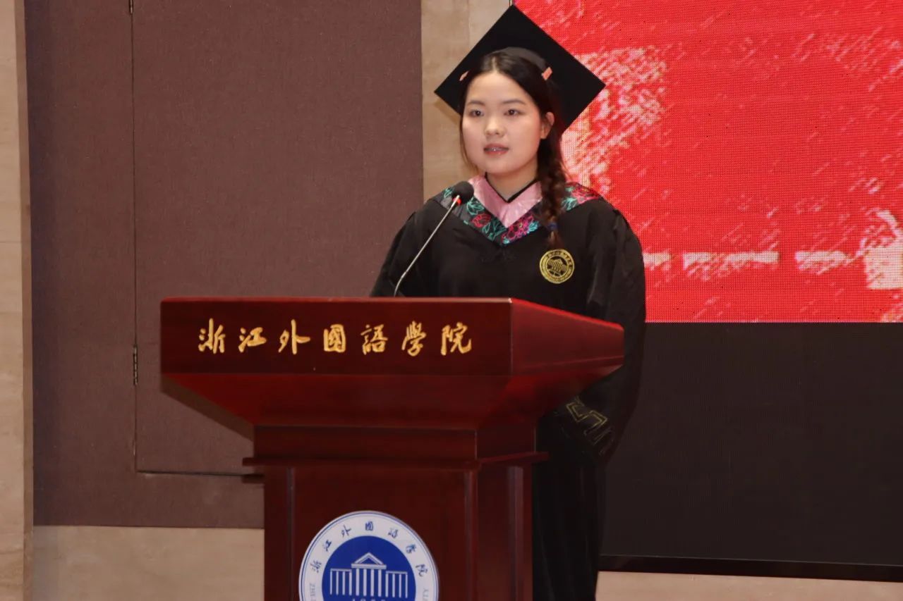 日语专业的周怡璐作为毕业生代表发言。“经历了四年的磨练,我们已经有了面对风雨的勇气,有了不断学习的能力,有了从失败中爬起来继续走下去的决心。”她表示今后将会带着浙外赋予的“语言底气”去迎接未知的挑战,同时对家长与老师们表达衷心的感谢。