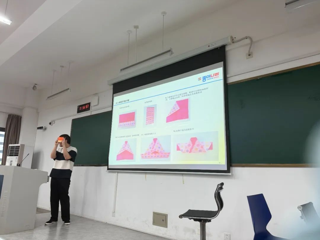 活动中,各位老师向同学们分发材料和工具,孙霁老师教授同学们手工制作韩服折纸的制作步骤。现场气氛热烈,同学们根据老师的示范,专心致志地制作传统纹样的韩服折纸。