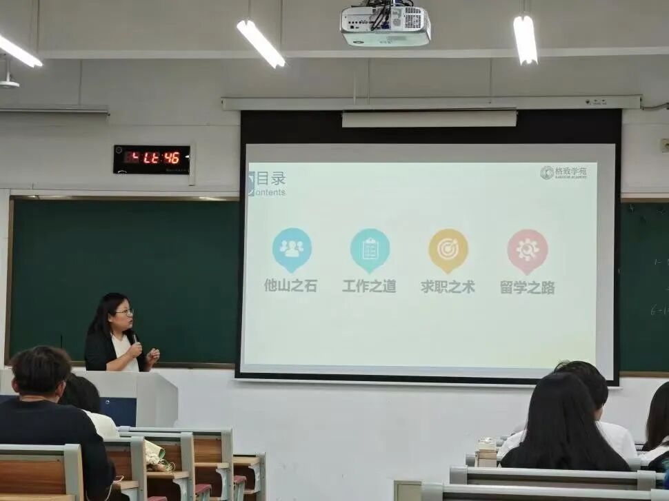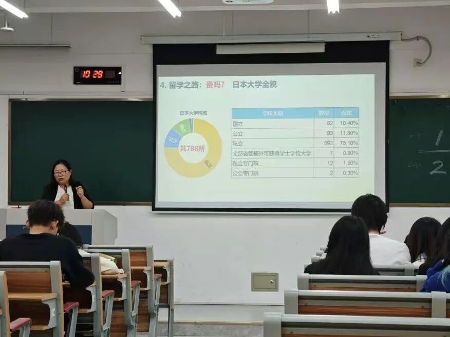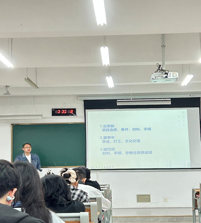 10月20日,日语系周正律老师为2024级的同学们详细介绍了学校现有的海外升学、留学及实习项目。2021、2022级的学长学姐们也通过现场及线上的方式,倾情分享了他们的留学经历与切身感受。本次宣讲会帮助同学们对留学规划有了更清晰的认识,为有志于海外深造的学子提供了及时的信息支持。
