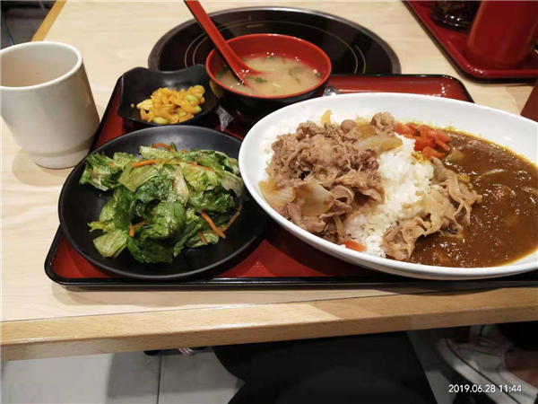 这次的日本料理在杭的发展实践活动,我们向老师询问在杭州有名的日本料理店,并自己去了店里品尝料理,我去的是食其家,是一家以牛丼饭闻名的日本料理店,还有一些别的料理,比如拉面和咖喱饭,都是日本料理中的家常主食。为了多些体验感受,我们每个人各自吃了一样东西,我点的是牛肉咖喱饭套餐,食其家的咖喱偏咸带一点甜味,是那种不辣的咖喱,其他的配餐也是味道清淡的,比较注重食物本身的味道,与杭州菜差别很大。——18日语2班 庄素素