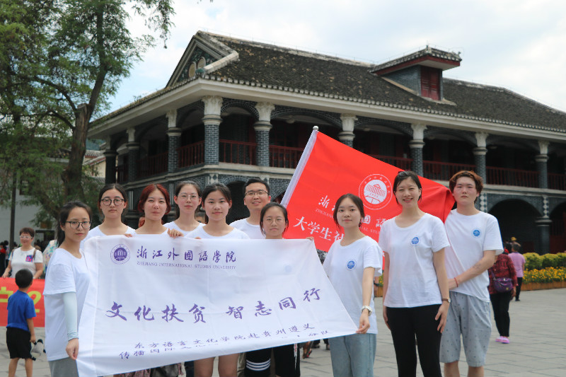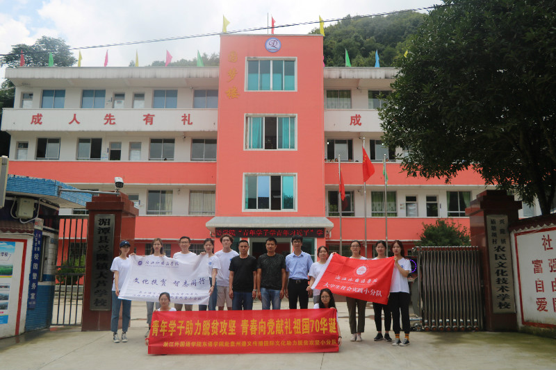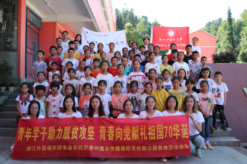 “传播国际文化,助力脱贫攻坚”社会实践小分队遇见这些孩子时第一想法。这个暑假,有这样一群浙外青年远赴红色圣地贵州遵义,把新兴的多语种文化体验课堂搬到了时代楷模、排雷英雄杜富国的家乡湄潭县兴隆镇,和大芦学校三到八年级的学生一起做寿司、贴海娜、唱韩谣……带着这群渴望知识的“大眼睛”进行了数日丰富多彩的国际文化体验。
