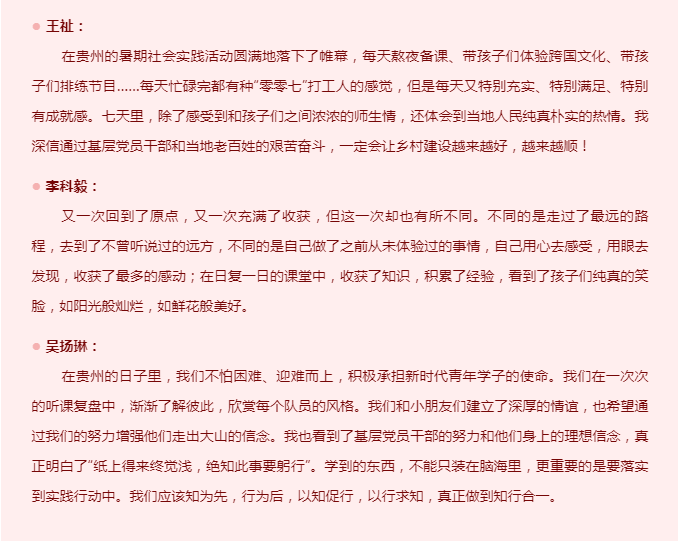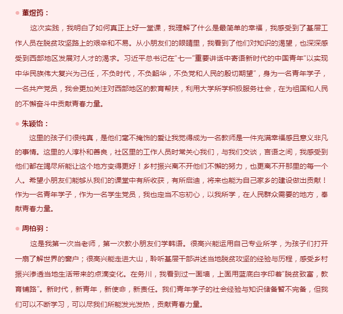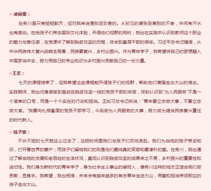 “前不久,习近平总书记在庆祝中国共产党成立100周年大会上庄严宣告,我们在中华大地上全面建成了小康社会,历史性地解决了绝对贫困问题。在务川,我们直观感受到总书记庄严宣告的重要意义”“每一位投身脱贫攻坚的党员干部都值得我们敬佩。作为大学生,我们也希望能够通过社会实践切实为乡村振兴贡献力量,在教育帮扶中点燃留守儿童们的梦想,践行青年大学生的时代担当。”队员们在听完党课后纷纷感慨。他们相信,未来会有更多的浙外青年来到这里,为更多这里的孩子播撒梦想的种子,为乡村振兴贡献青春力量。