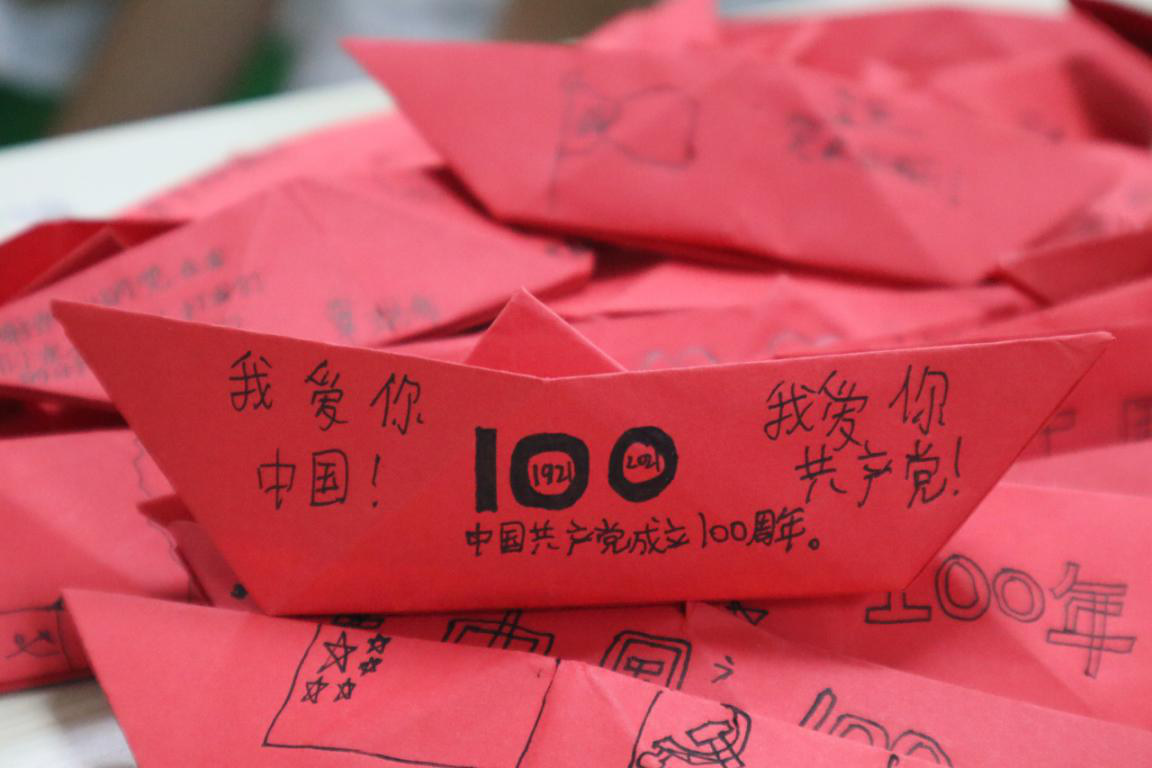 “中国又叫种花家,是因为我们都是祖国的花朵!”孩子们总是童真而又浪漫。课堂上,队员们和小朋友互相佩戴红领巾,孩子们在一个个亲手折的红船上书写对祖国、对党最真挚的祝福。