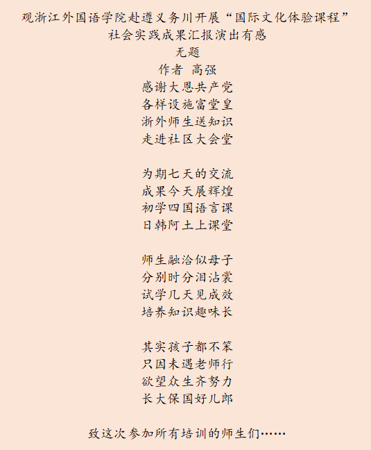 7月23日下午,队员们和孩子们一起进行了汇报演出,将教学成果展示给孩子们的家人和社区居民。大合唱《红星闪闪》,日语舞蹈《爱跳舞的甜甜圈》,融入阿拉伯语和务川方言元素的情景剧,中韩双语舞蹈《三只小熊》,中土双语诗歌朗诵《关山月》《敕勒川》,给现场观众带来了一场特殊的文化盛宴。务川团县委副书记邓欢、敬贤社区党总支书记马华锋等观看了演出,并对实践团队表示感谢和肯定。最后,队员们为孩子们送上精心准备的笔记本和钢笔,用中外文写下对孩子们的祝福,并告诉他们:“在山的那边,是海!是用信念凝成的海!”