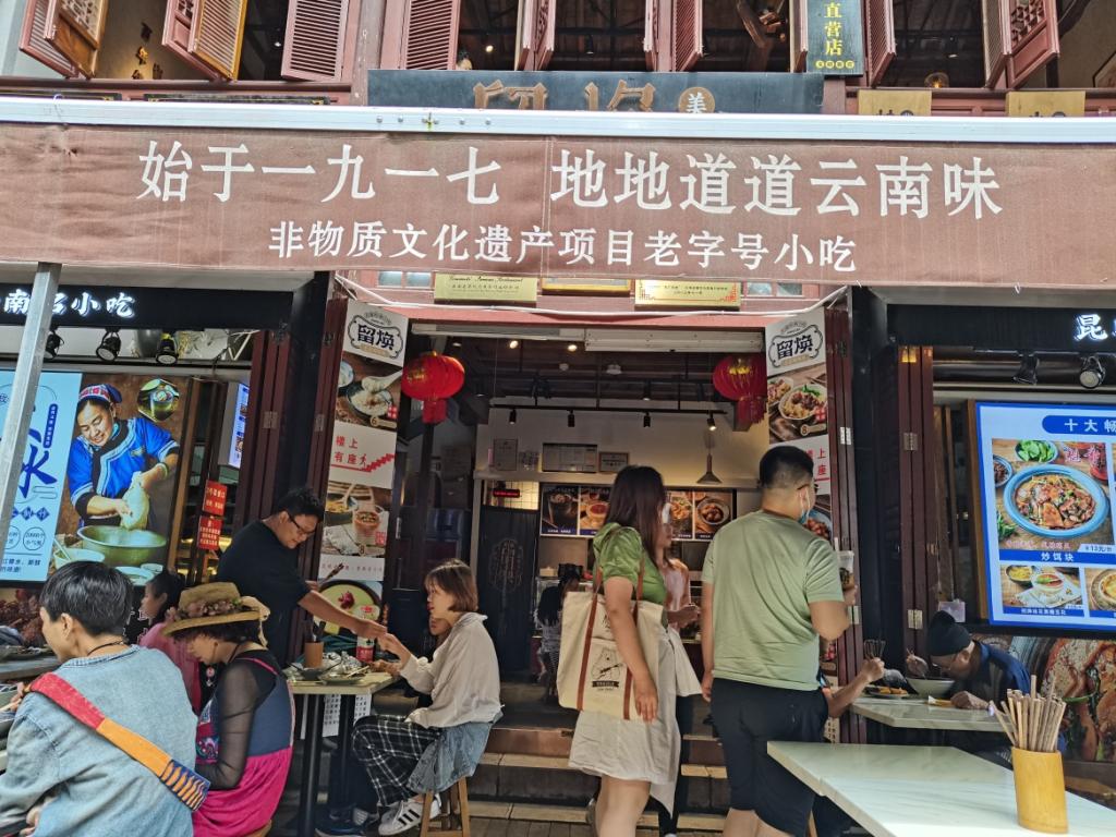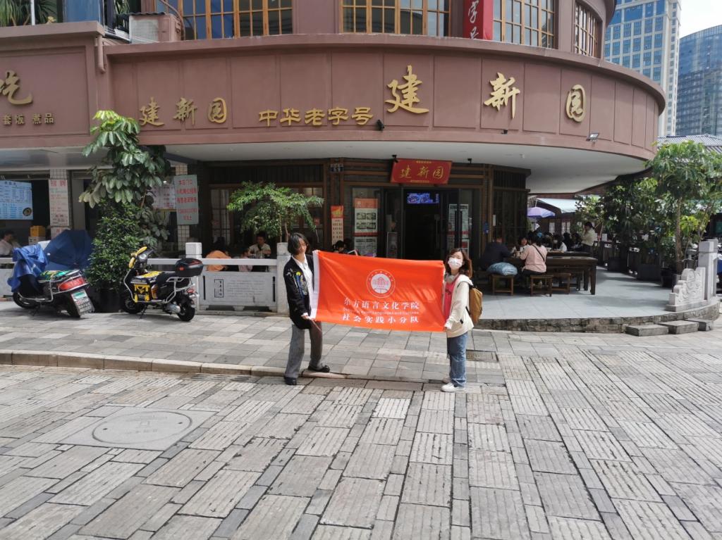 实践中,部分队员在昆明市官渡区、红塔区等地开展了实地走访。这里有福林堂旧址、云南鲜花饼老字号潘祥记、德和食品、孔雀银楼银饰品、留焕小吃等老字号,但最具云南特色的美食还是过桥米线。商务部认证的中华老字号建新园过桥米线的总店塘子巷店位于昆明官渡区繁华的北京路上。队员们了解到,建新园是昆明本地老字号之一,环境为仿古装修,年纪较大的爷爷奶奶是这里的常客。