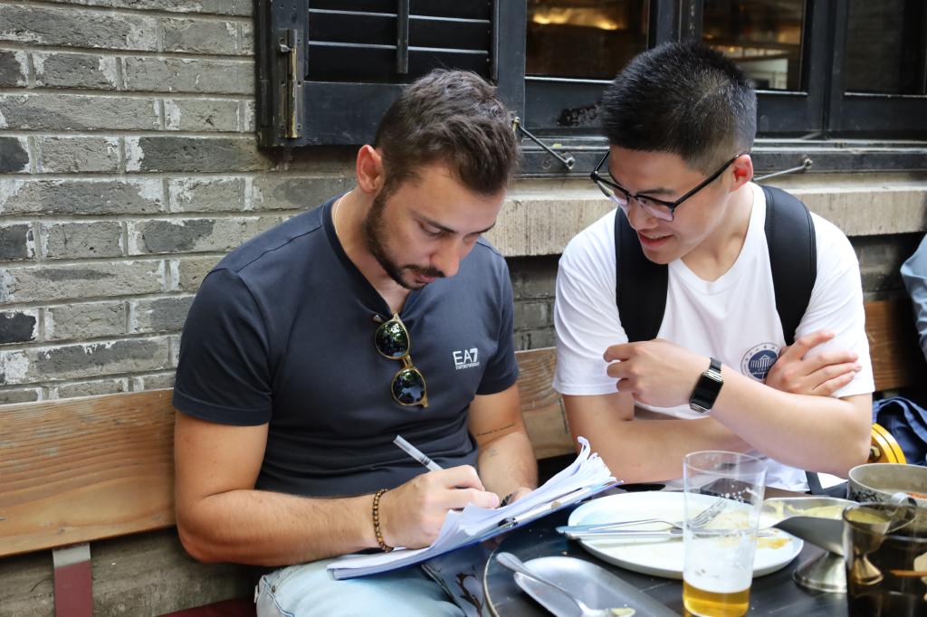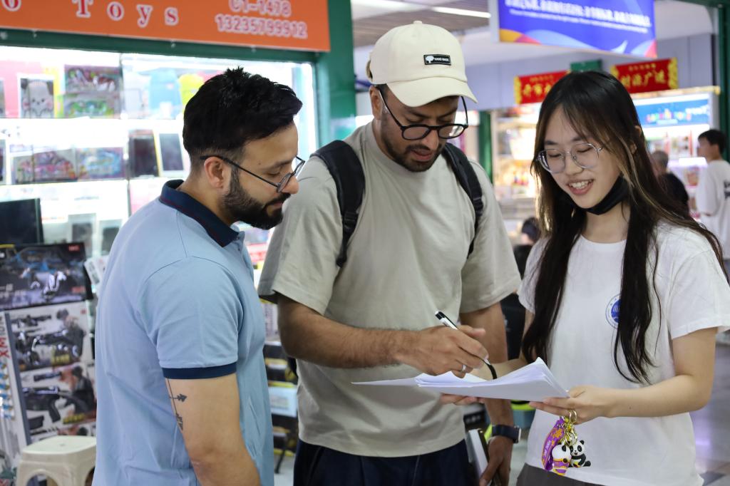 身着带有浙外社会实践标志的T恤衫,秉持着传播好中国故事的信念,我们意识到,自己的一举一动代表着学校乃至祖国的形象,交流过程中保持大方得体的形象十分重要。无论对方是否接受回答问卷的请求,我们都会微笑鞠躬表示谢意。一份完整的问卷回答完毕大致需要4-6分钟,考虑到商人的时间也极为宝贵,因此每当一份问卷填写完成,我们也会将带有中国元素的挂件赠予参与者。