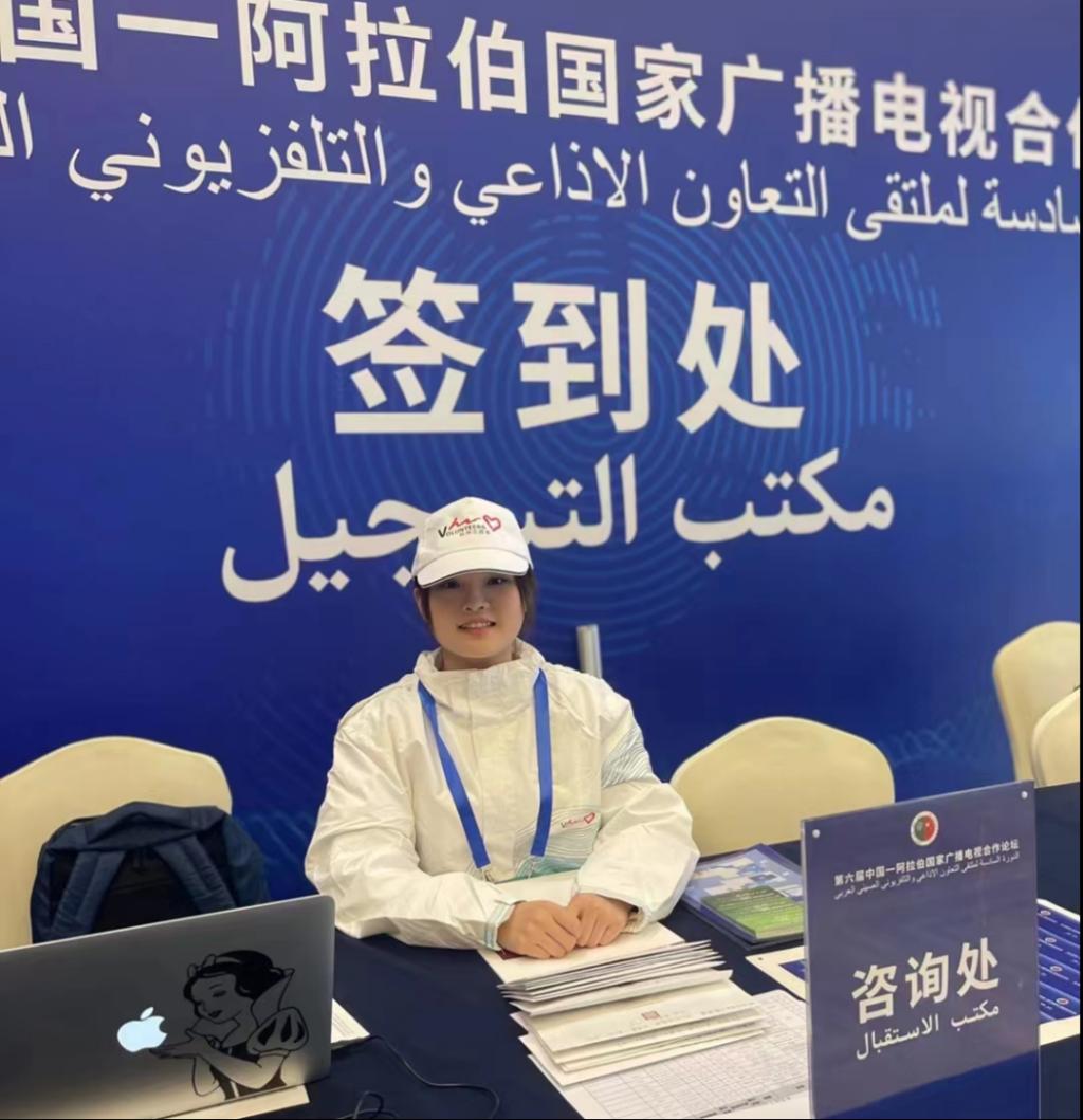 跨境电子商务专业大二学生罗语桐因亚运会、亚残运会期间担任伊拉克代表团NOC助理与阿拉伯人民结缘。在这次论坛志愿服务中,她负责酒店接待和论坛现场语言服务及场地引导。当看到熟悉的中东面孔,听到熟悉的阿拉伯语,亲切感油然而生。她始终铭记用微笑和语言搭建中阿沟通的桥梁。她在志愿服务中向外宾介绍中国在广播电视方面的技术、中国的文化,为自己参与志愿服务而自豪。