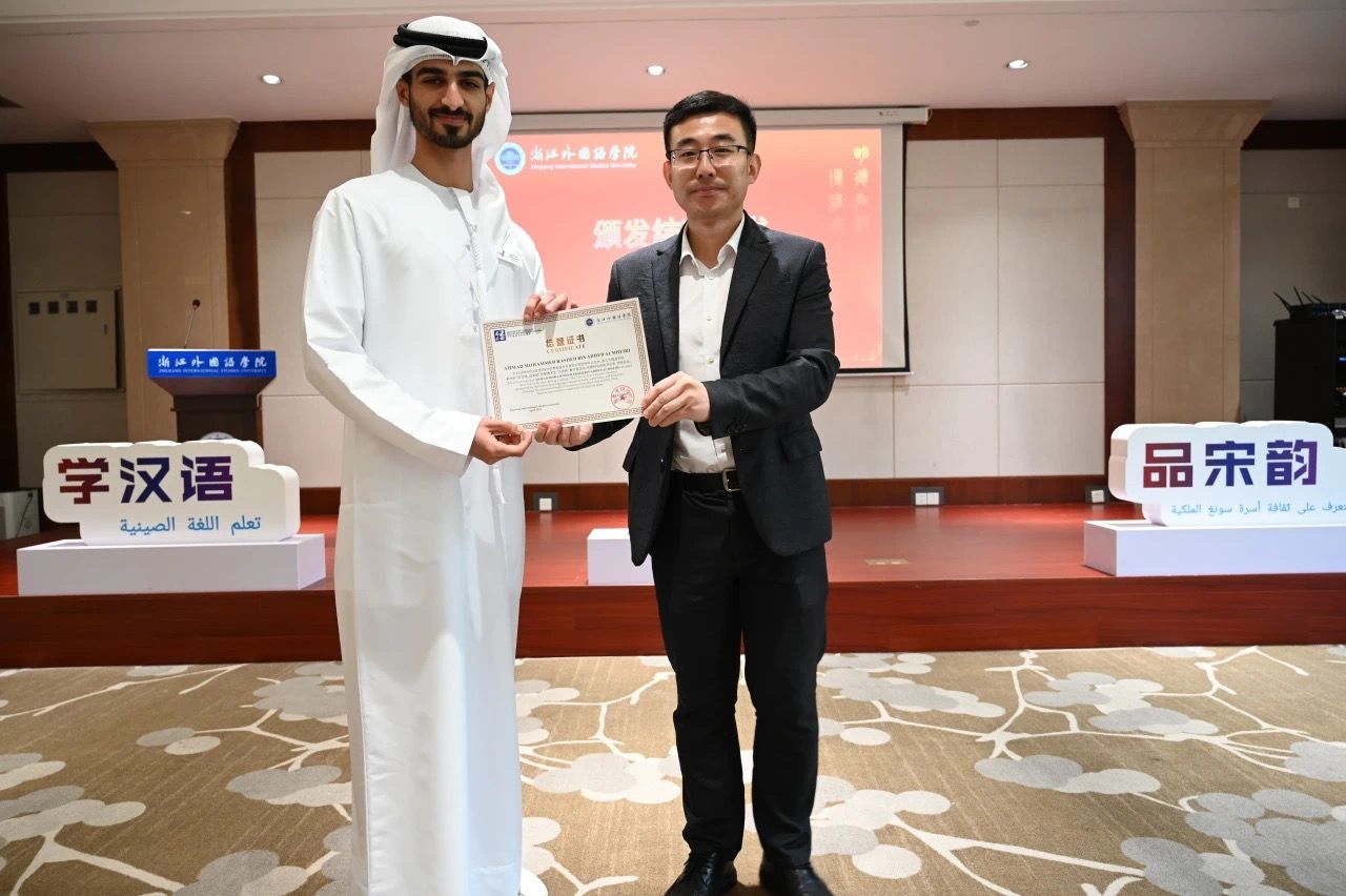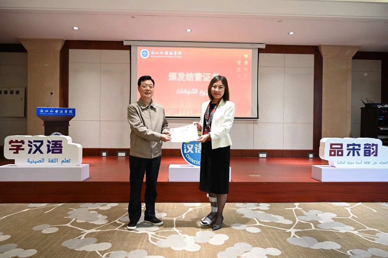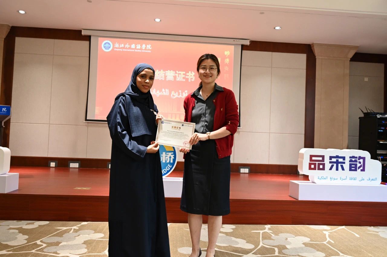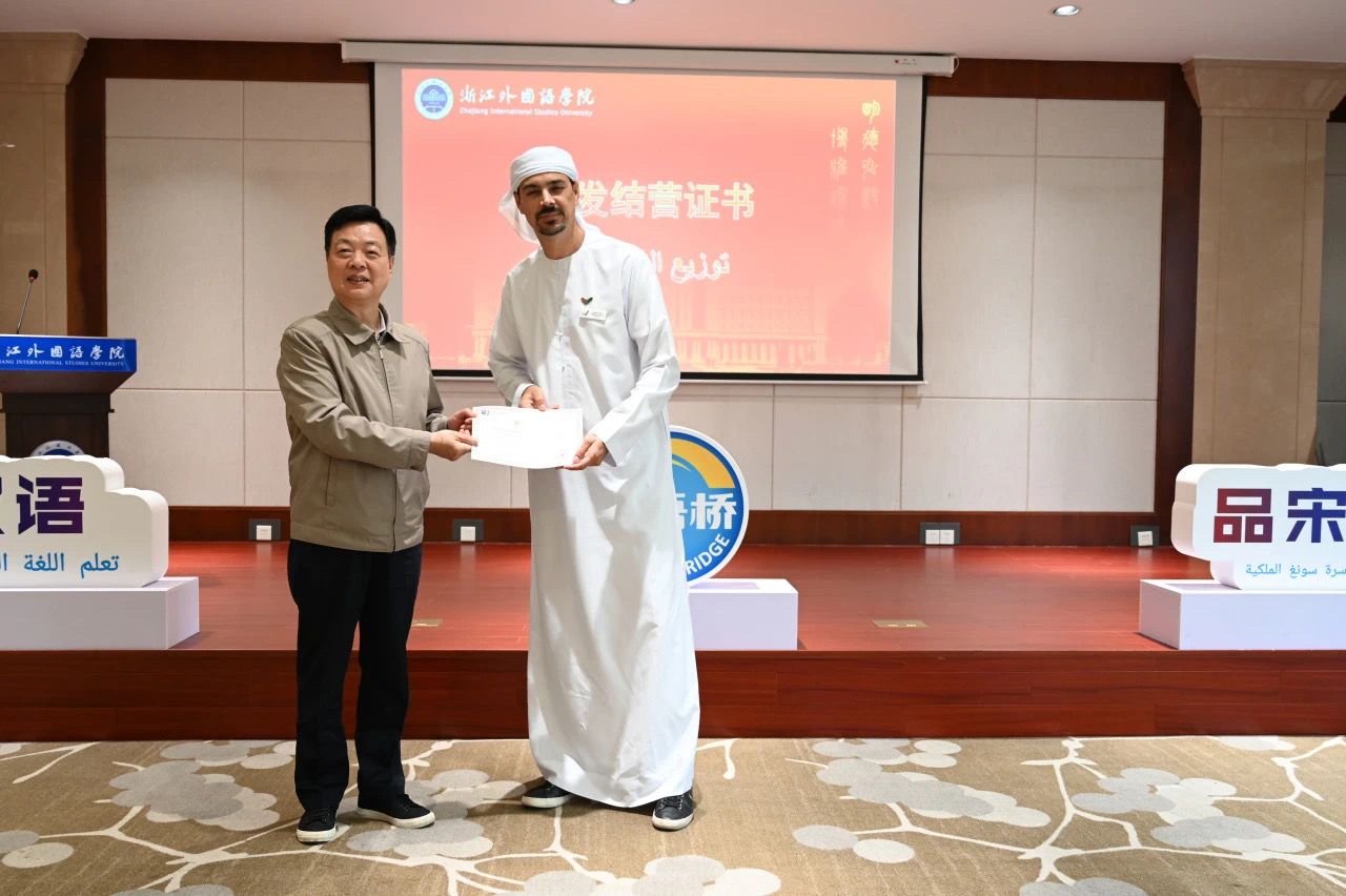 随后,柴改英为阿联酋教育部创新创业司活动和会展主管阿伊莎·哈桑女士颁发结营证书。校国别和区域研究中心主任周烈为阿联酋学生“汉语桥”团组带队教师马蒂亚斯·勒特梅先生和戴京倞女士颁发结营证书。与会其他嘉宾分别为27名营员颁发结营证书。