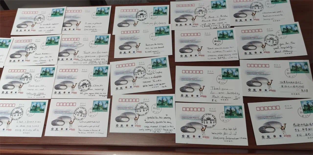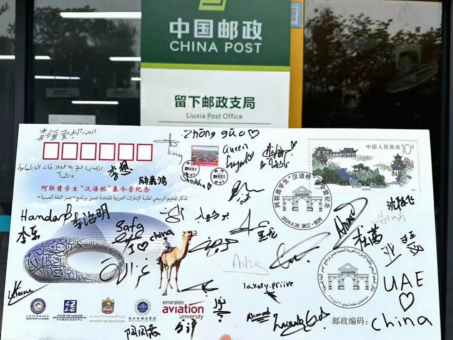 在最后的外交封活动环节,柴改英与阿伊莎·哈桑女士共同为阿联酋学生“汉语桥”春令营纪念封揭幕,并一同盖上定制的中阿双语纪念戳,全体与会成员还在纪念封上签下自己的名字。揭幕仪式后,主办方还为每名营员分发了纪念封样式的明信片。值得一提的是,所有明信片均已贴好邮票,并经由西湖区留下邮政支局盖上了“4.28,留下”日戳。