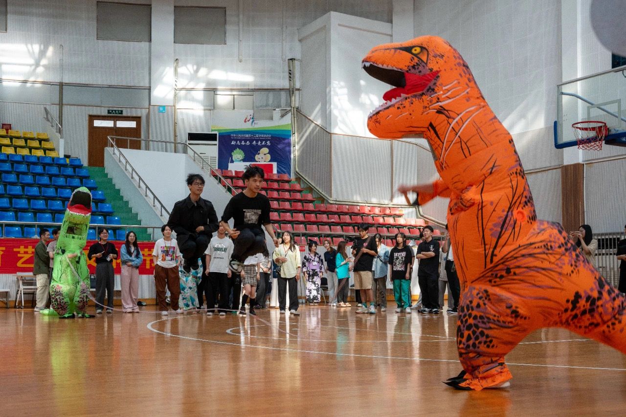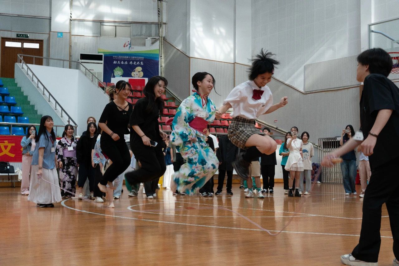 在行健馆,日本福井县青年还带来了特别的表演节目,恐龙长绳。福井有着日本最知名的恐龙博物馆,恐龙甩起长绳,中日青年在一次又一次的跳跃之中,感受到了心与心的碰撞与共鸣。