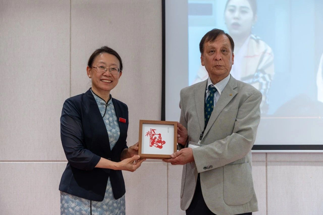 柴改英将我校日语系学生为此次活动精心准备的非遗剪纸作品赠与郡和义先生。福井县日中友好协会事务局次长森下育夫先生回赠了一幅《水仙花》作品。